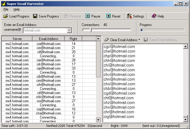 Super Email Harvester extracts e-mail addresses from targeted email servers. It connects to the email server directly and simulates sending a message, but does not send the message out - Super Email Harvester disconnects as soon as target email server informs whether this address exists or not.